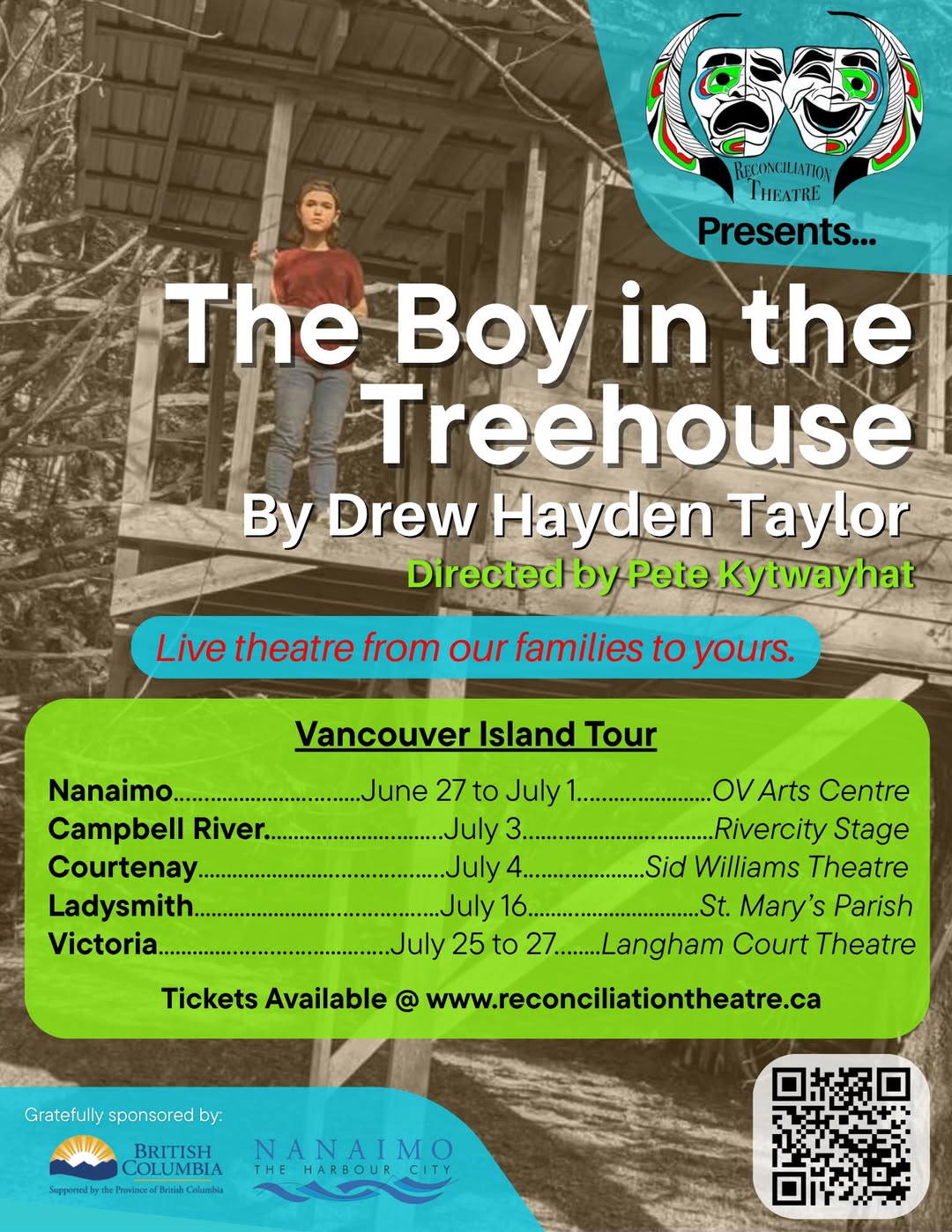 Reconciliation Theatre will be sharing the stage with a short (about 30 mins) Indigenous Production out of Victoria titled Gold. They will perform before The Boy in the Treehouse on Friday, July 25 and Sunday, July 27.